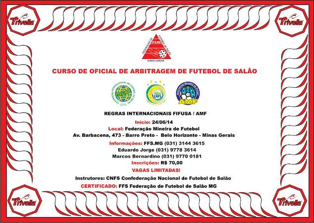 As competições em Minas Gerais estão se multiplicando graças ao grande trabalho da Federação de Futebol de Salão de MG (antiga AMFS - Liga Mineira). A Federação Mineira, com duas competições em andamento (Copa MAB – principal masculino e Campeonato Mineiro Kaizen de 2014 – principal feminino), já possui excelentes árbitros formados em seu primeiro curso em 2013, mas pretende realizar mais duas competições neste segundo semestre e tem urgência em ampliar o seu quadro de arbitragem devido a demanda dos campeonatos e a expansão do futebol de salão AMF no Estado de Minas Gerais. O curso tem supervisão e acompanhamento dos instrutores da CNFS.
