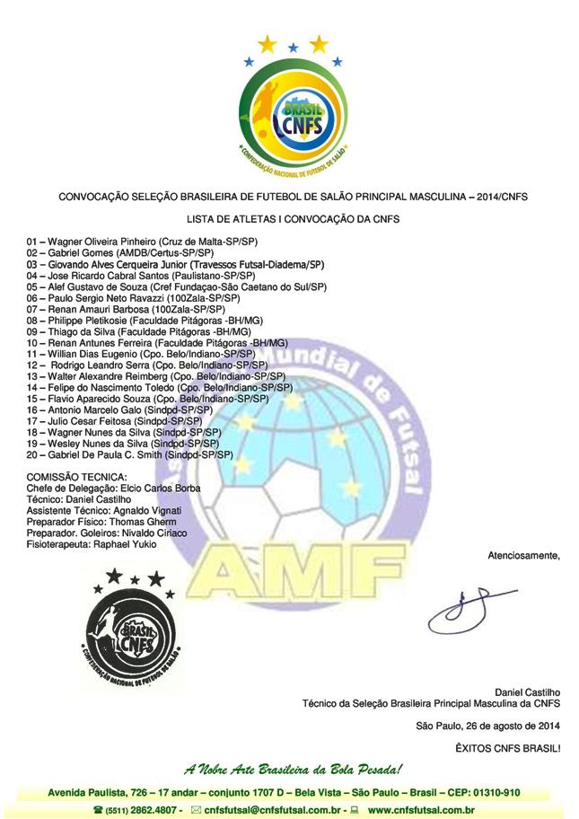 I Convocação da Seleção Brasileira de Futebol de Salão da CNFS - Eliminatórias para o Mundial Bielorrússia 2015