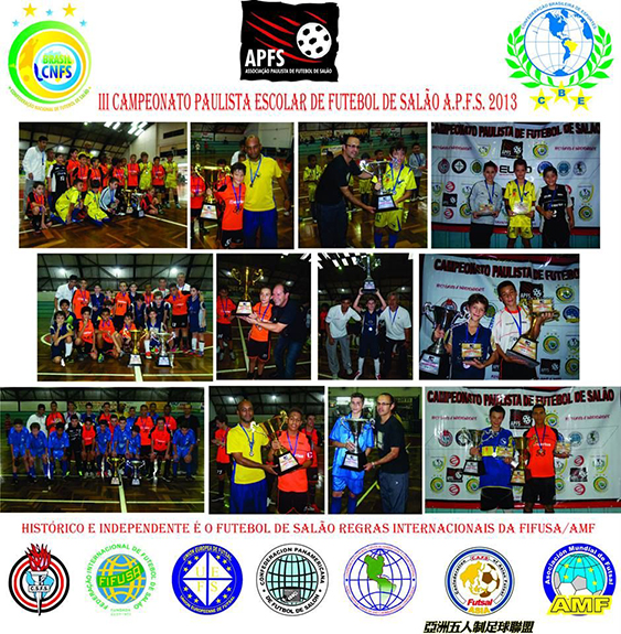 III Campeonato Paulista Escolar de Futebol de Salão AMF 2013 difusão do futebol de salão nas regras da AMF Associação Mundial de Futebol de Salão http://www.amfutsal.com.py e UEFS União Européia de Futebol de Salão http://www.uefsfutsal.org/ Professores do Campeonato Paulista Escolar de Futebol de Salão AMF são convidados a atuar nas competições internacionais das regras AMF, a frente das Seleções Brasileira de Futebol de Salão / Categorias de Base da CNFS. É um privilégio ter tantos profissionais qualificados acreditando e ensinando o futebol de salão histórico e independente, vocês são responsáveis pelo sucesso da difusão do futebol de salão nas escolas, nas regras da AMF. Destacamos para 2013 os convites direcionados a CNFS no futebol de salão AMF para eventos internacionais como o Pré Mundial Infantil de Futebol de Salão AMF 2013 na Venezuela. Teremos competições nas categorias 10, 12, 14 e 16 organizados pelas entidades filiadas a AMF na Argentina e Canadá. Tão logo definidas as datas e cidades iniciaremos todo o tramite para firmamos as participações das Seleções Brasileira de Futebol de Salão / Categorias de Base da CNFS. Campeonato Internacional Infantil da AMF / Venezuela 2012 Colégio Certus - Vice-Campeão 2012 - Seleção Brasileira de Futebol de Salão da CNFS - Sub. 14 http://cbe.esp.br/?fn_mode=fullnews&fn_id=61 Êxitos a Nobre Arte Brasileira da Bola Pesada! Cnfs Brasil Confederação Nacional de Futebol de Salão